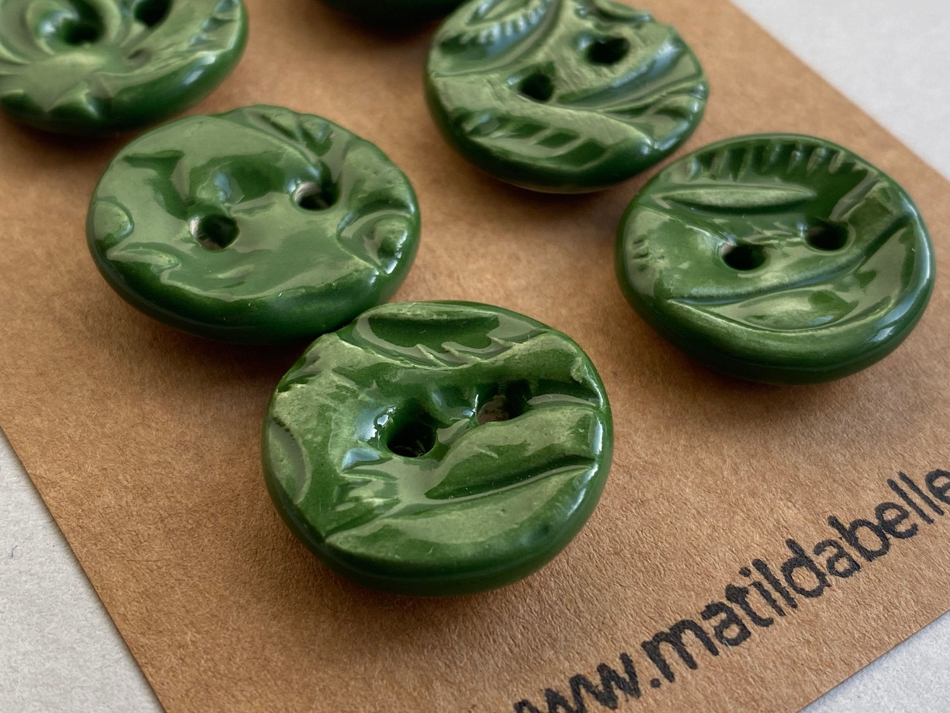 Set of 6 round Botanical Clay Buttons - 22mm - Glazed in Rich Forest Green