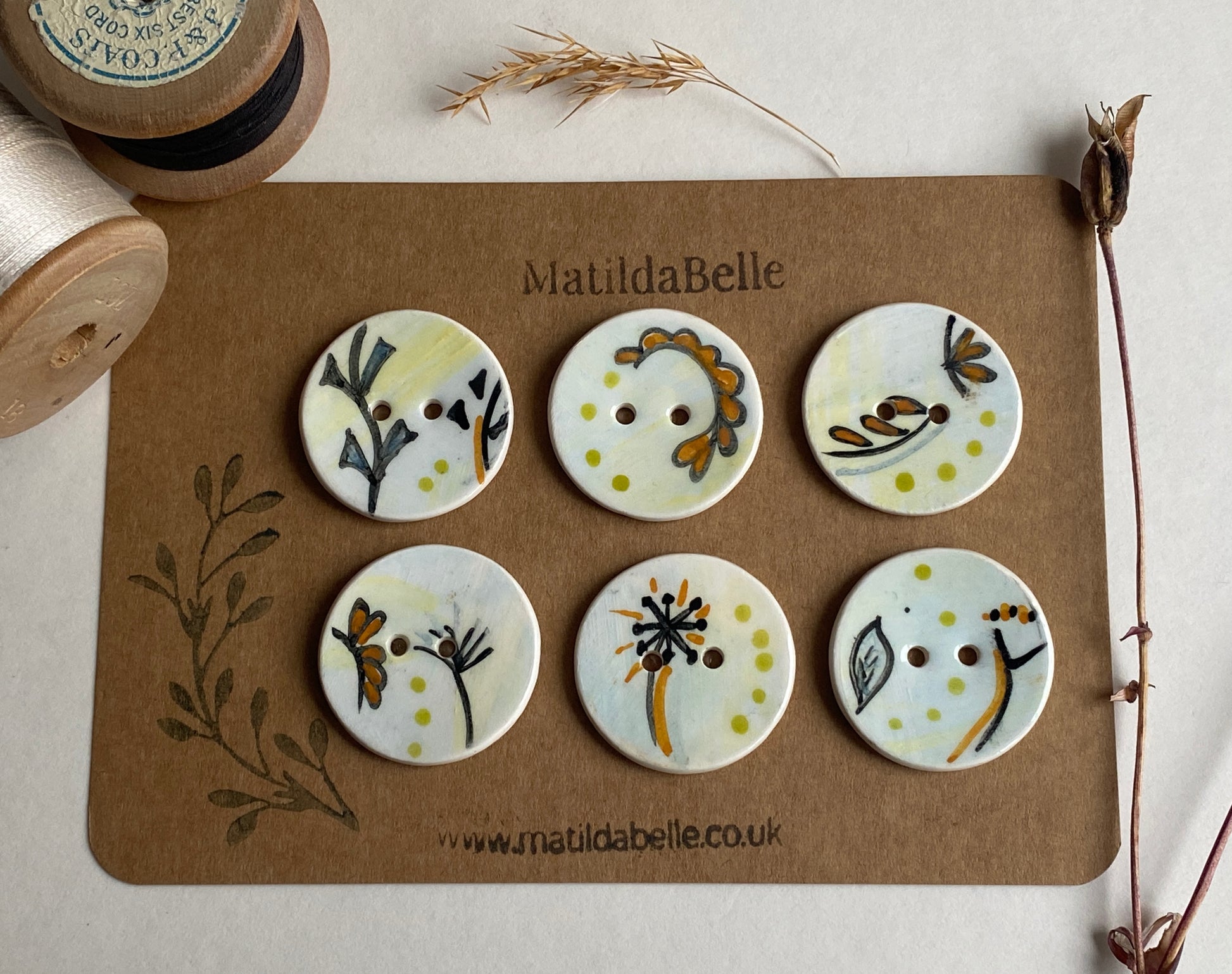 This gorgeous set of Six handmade ceramic round buttons have been hand painted with ceramic underglazes. Charming and whimsical illustrations inspired by the countryside around the pottery studio.