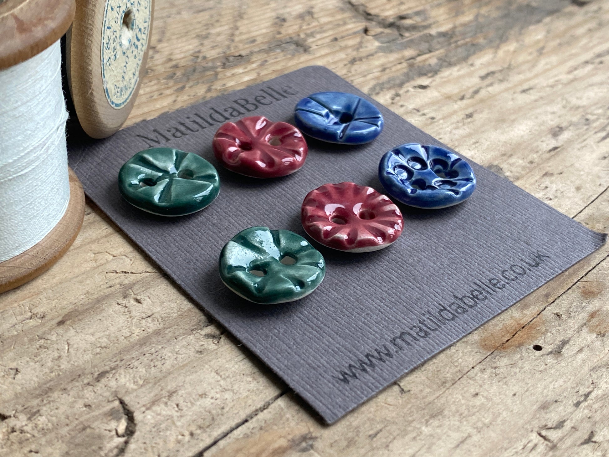 Introducing a set of six mismatched ceramic buttons inspired by vintage charm and glazed in luxurious mix of Green, Plum and Blue . Each button is uniquely shaped and hand imprinted to replicate vintage buttons in my cherished button tin.