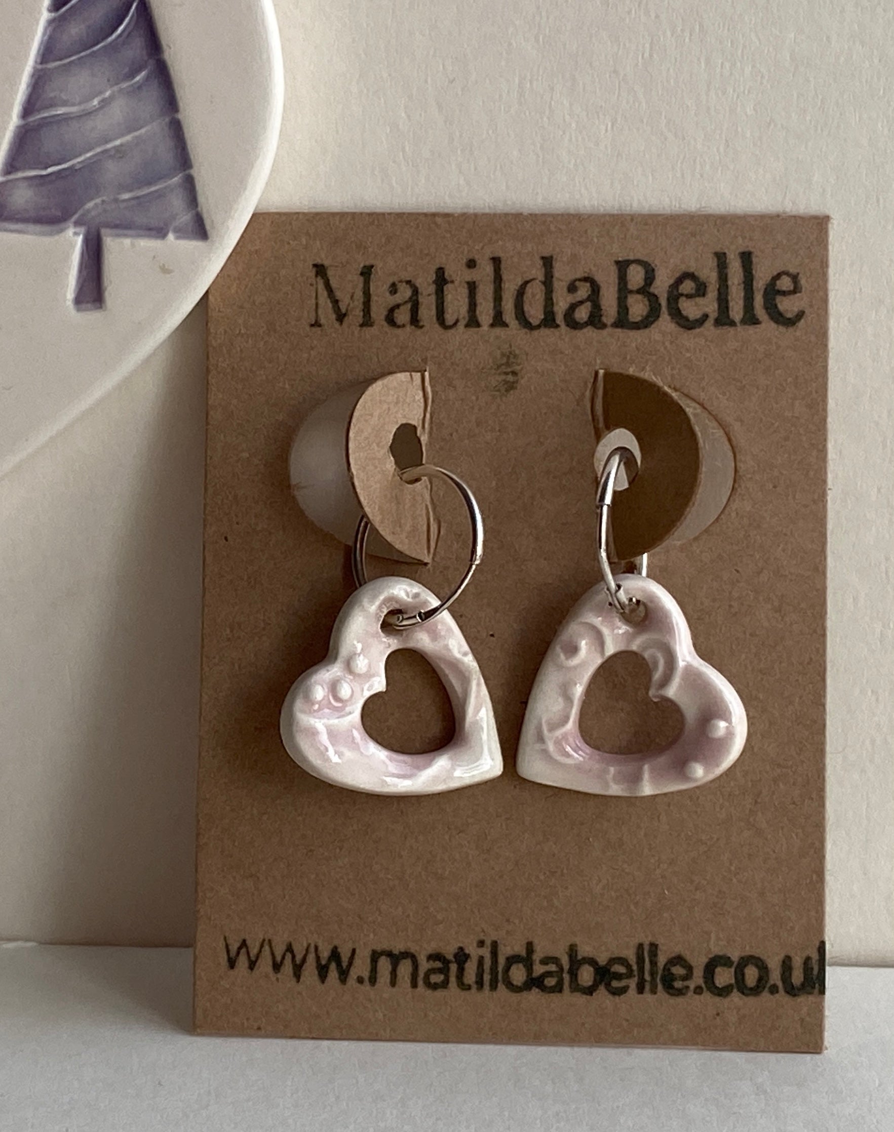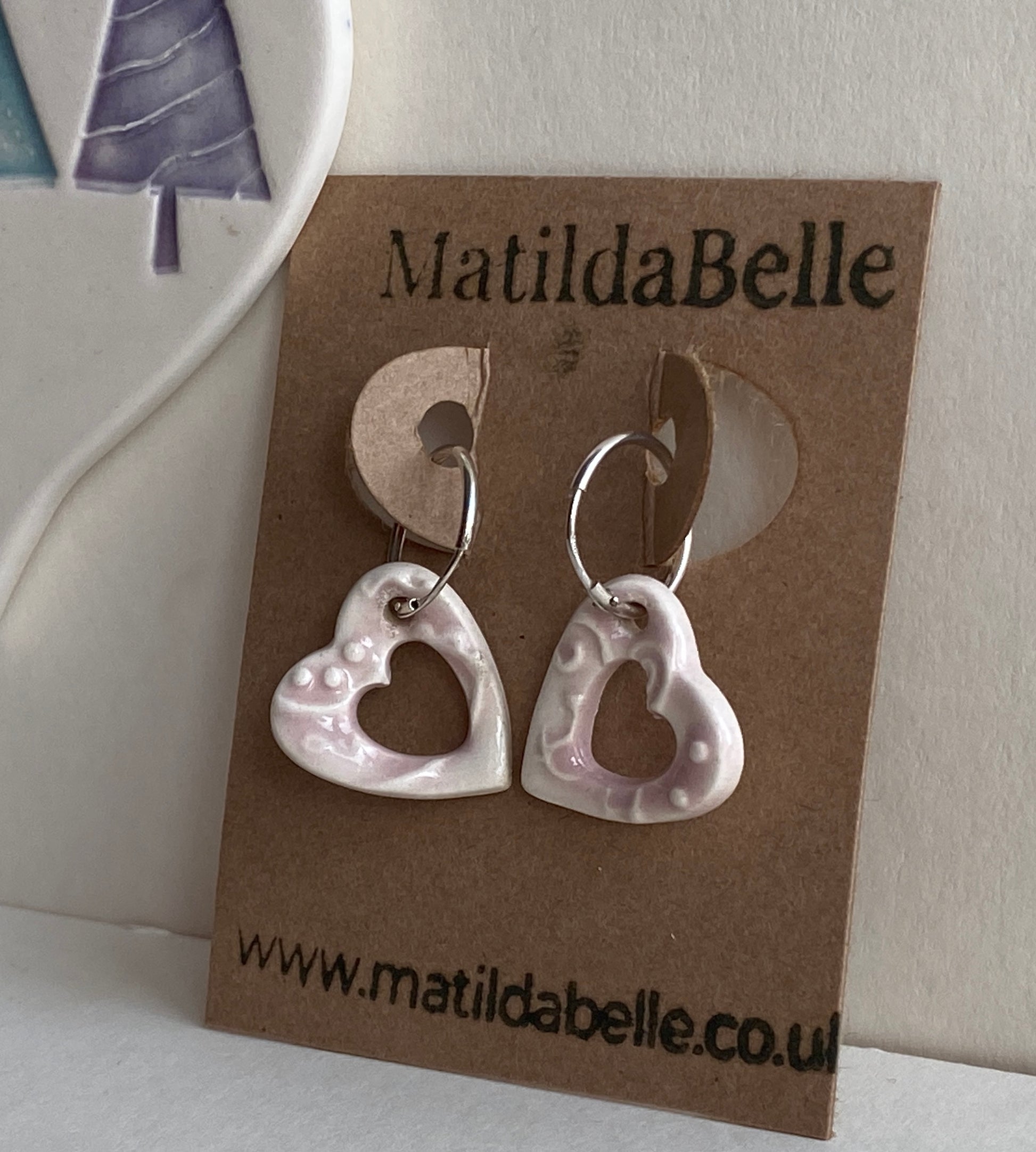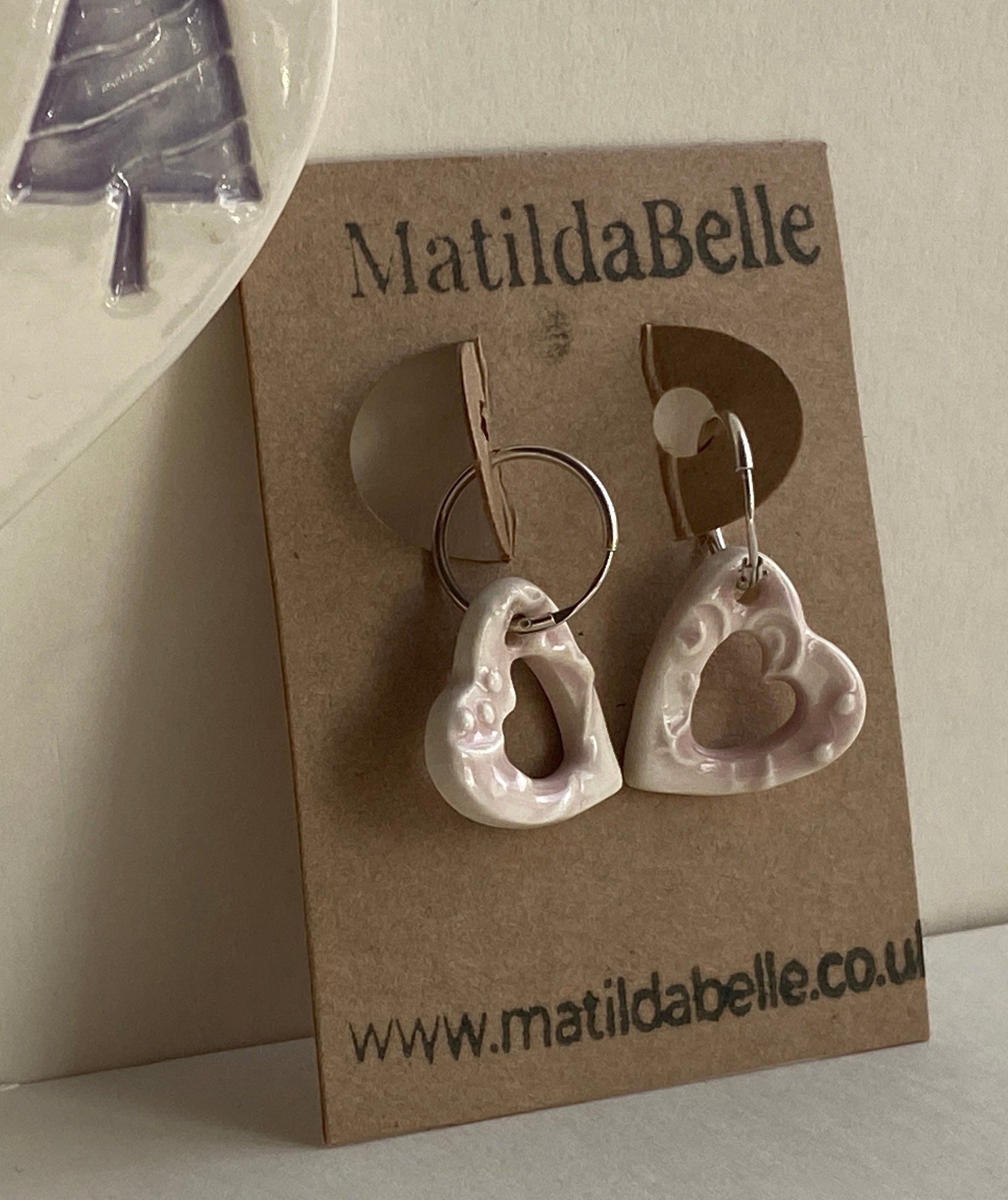 These handmade ceramic earrings have been formed from earthenware clay before being twice fired in a kiln for strength. These hearts have been imprinted with an original paisley craving before being glazed in the softest of pinks. Perfect handmade additions to any wardrobe style.