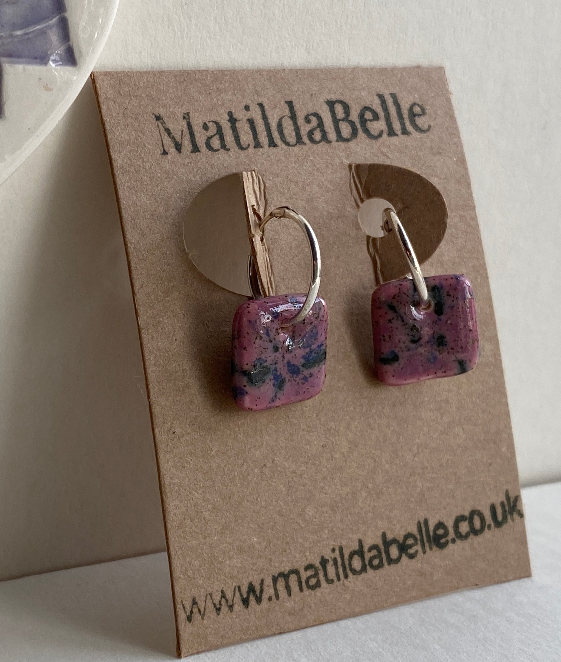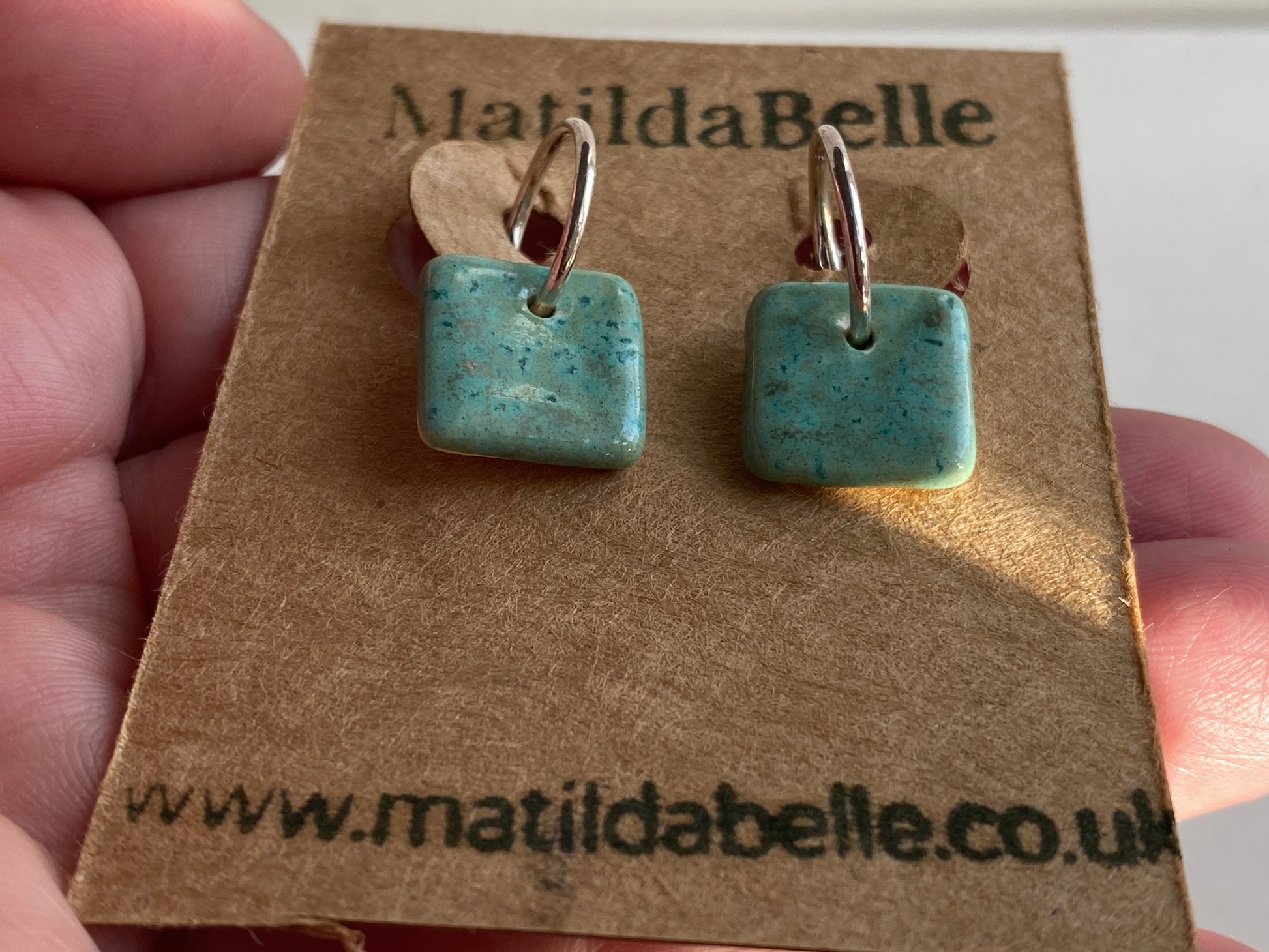 These handmade ceramic earrings have been formed from earthenware clay before being twice fired in a kiln for strength. The squares have been glazed in a choice of beautiful green with hints of gold or rich purple with bursts of blue and black. Please make you selection at checkout.