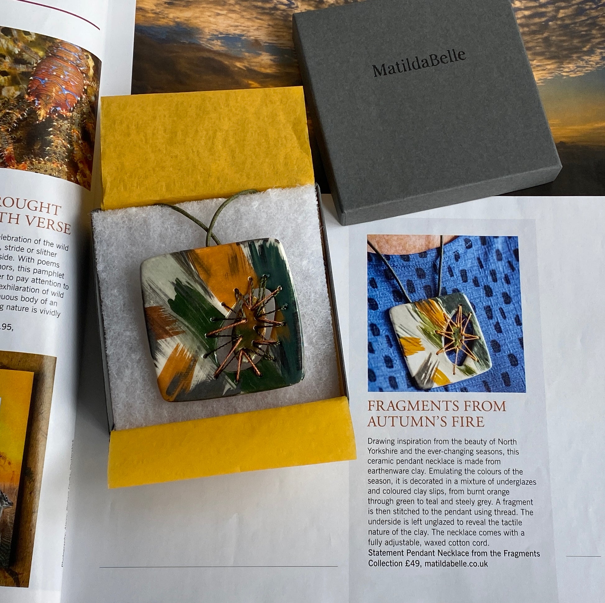 I glaze the pendants in natural tones of green, grey, ochre, black, and teal, which are influenced by the colours I’m surrounded by here in North Yorkshire—from the moors to the dry stone walls.