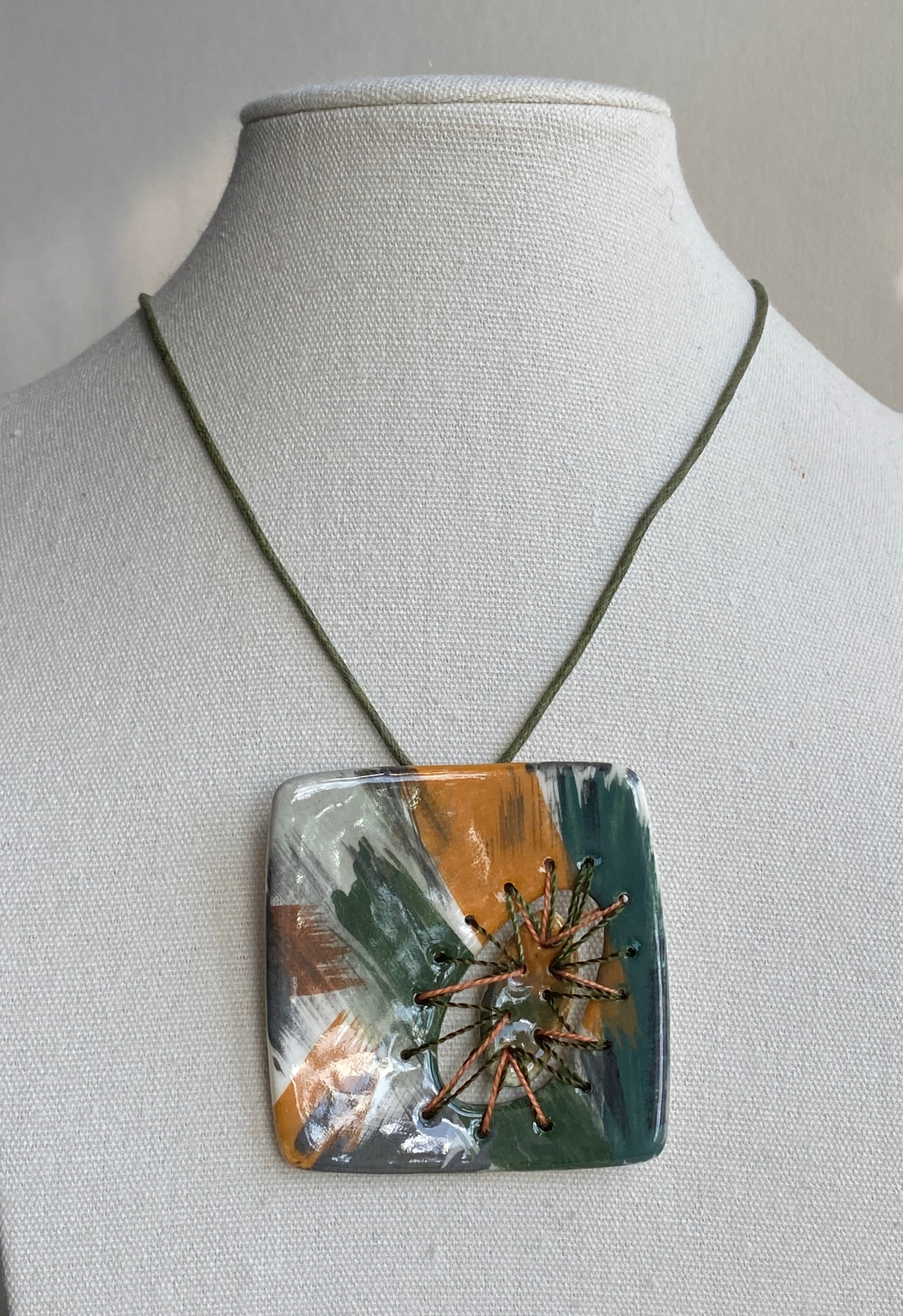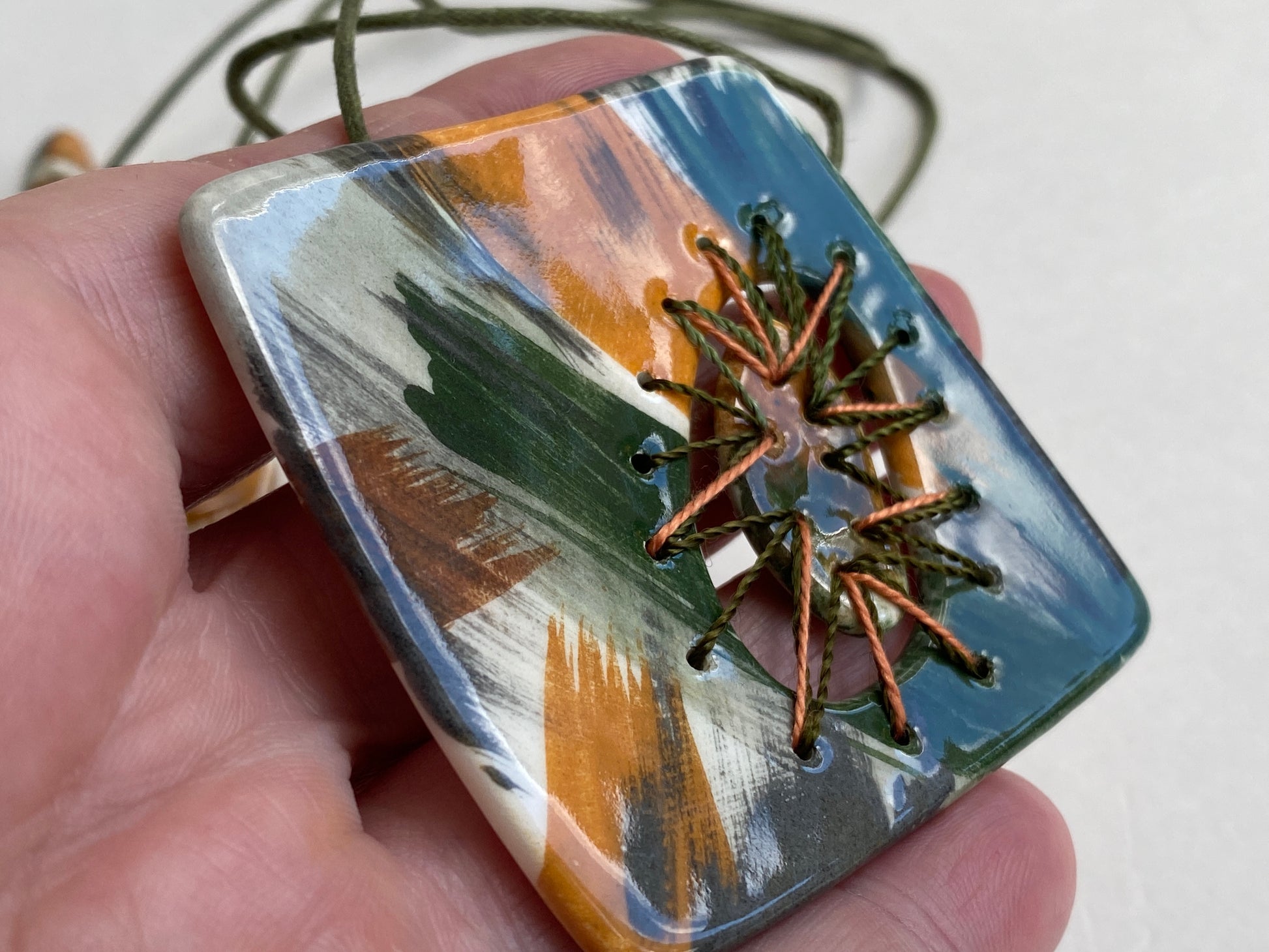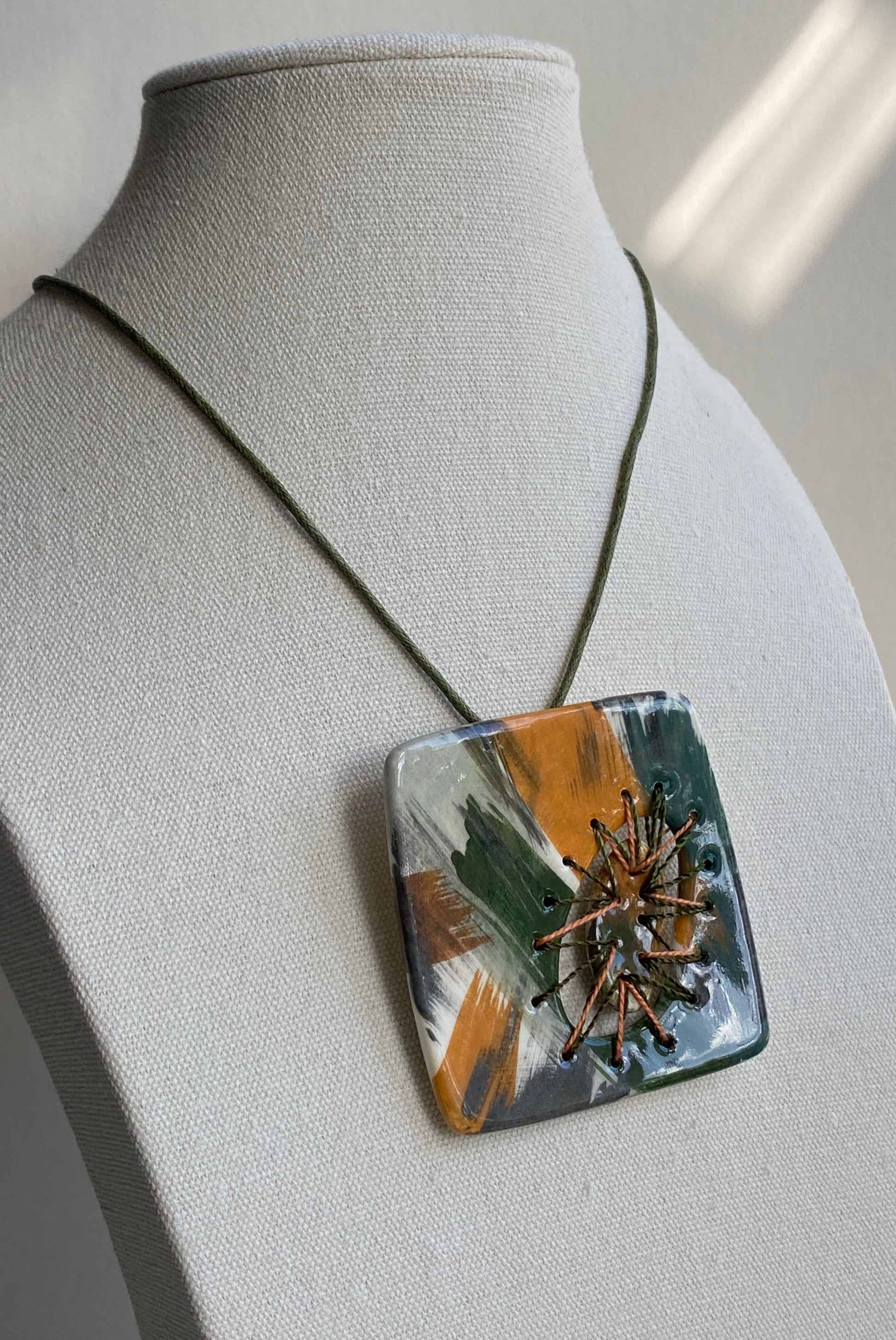 Handmade Ceramic Stitched Pendant Necklace Earthy Tones