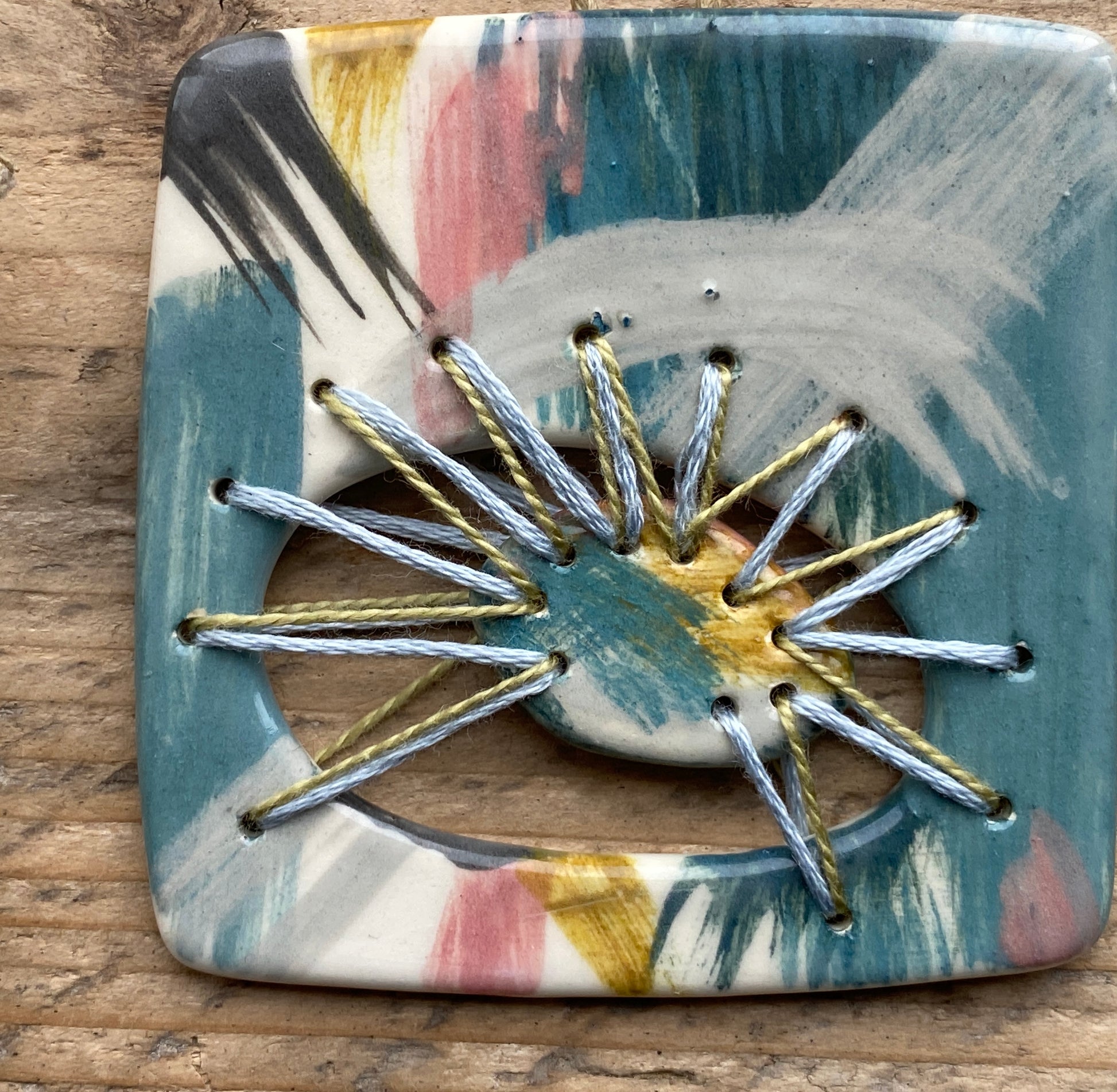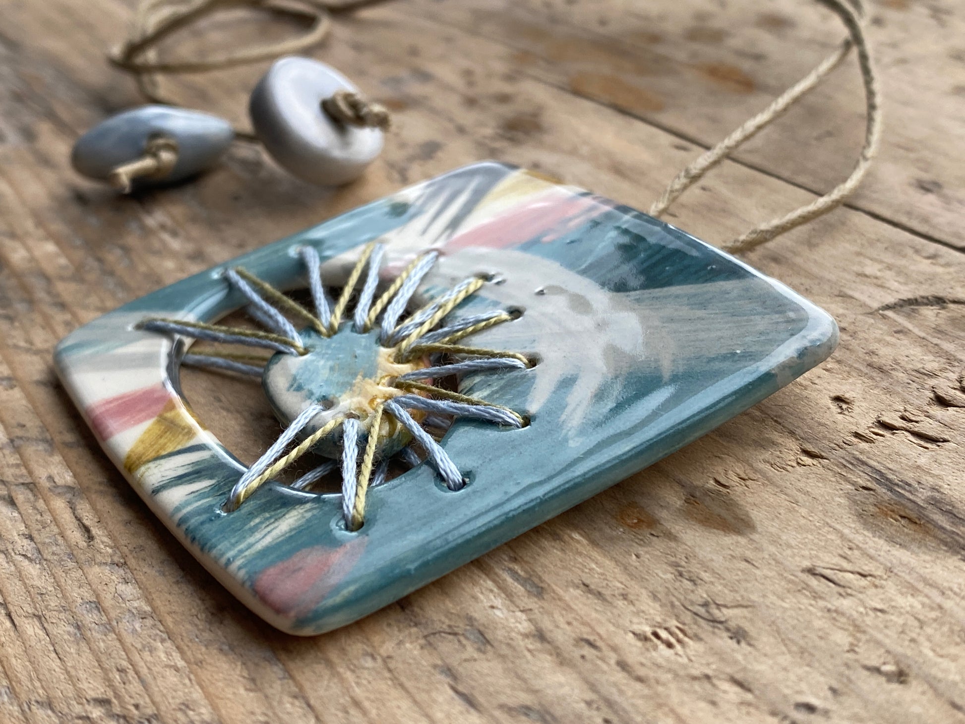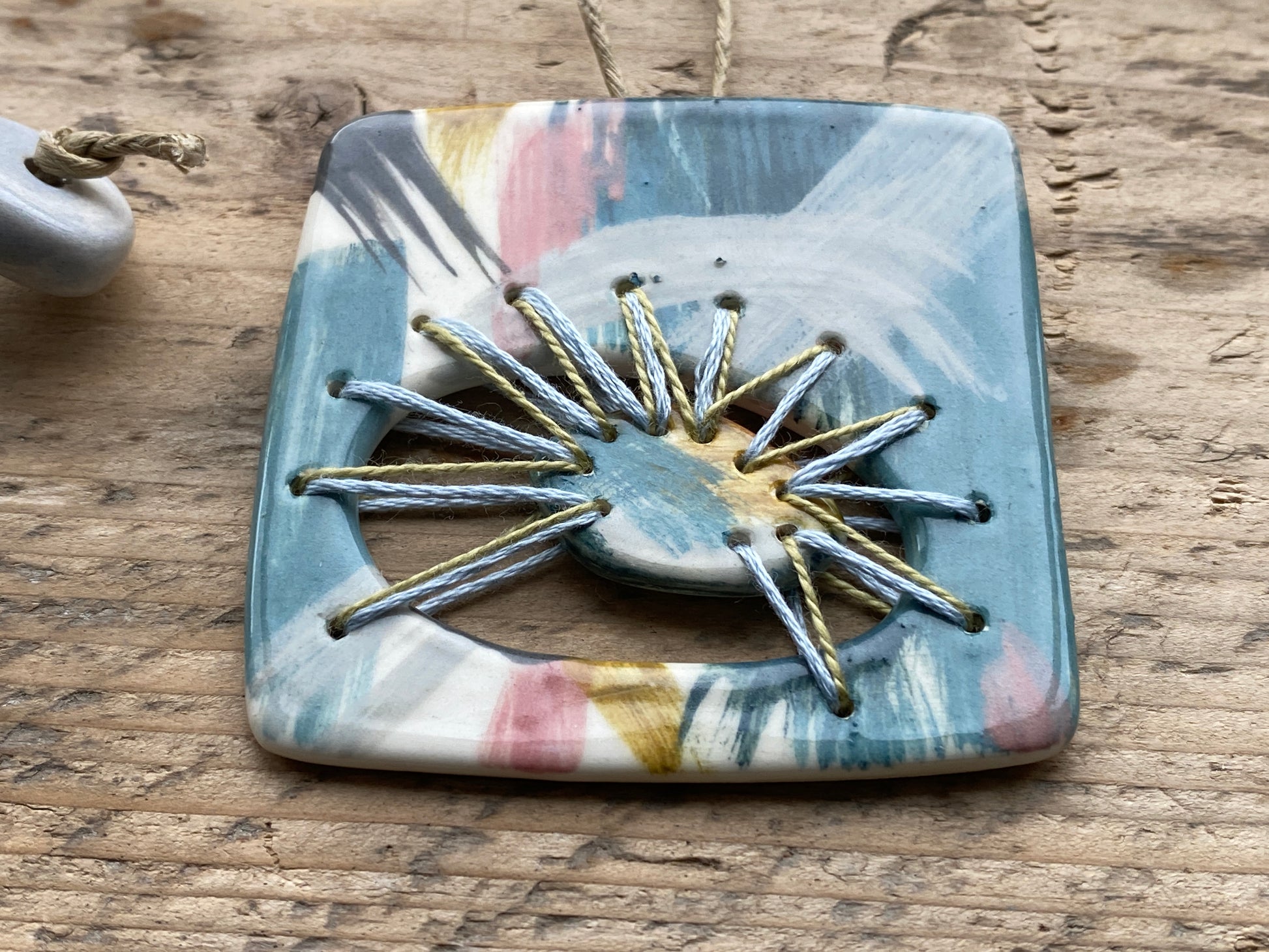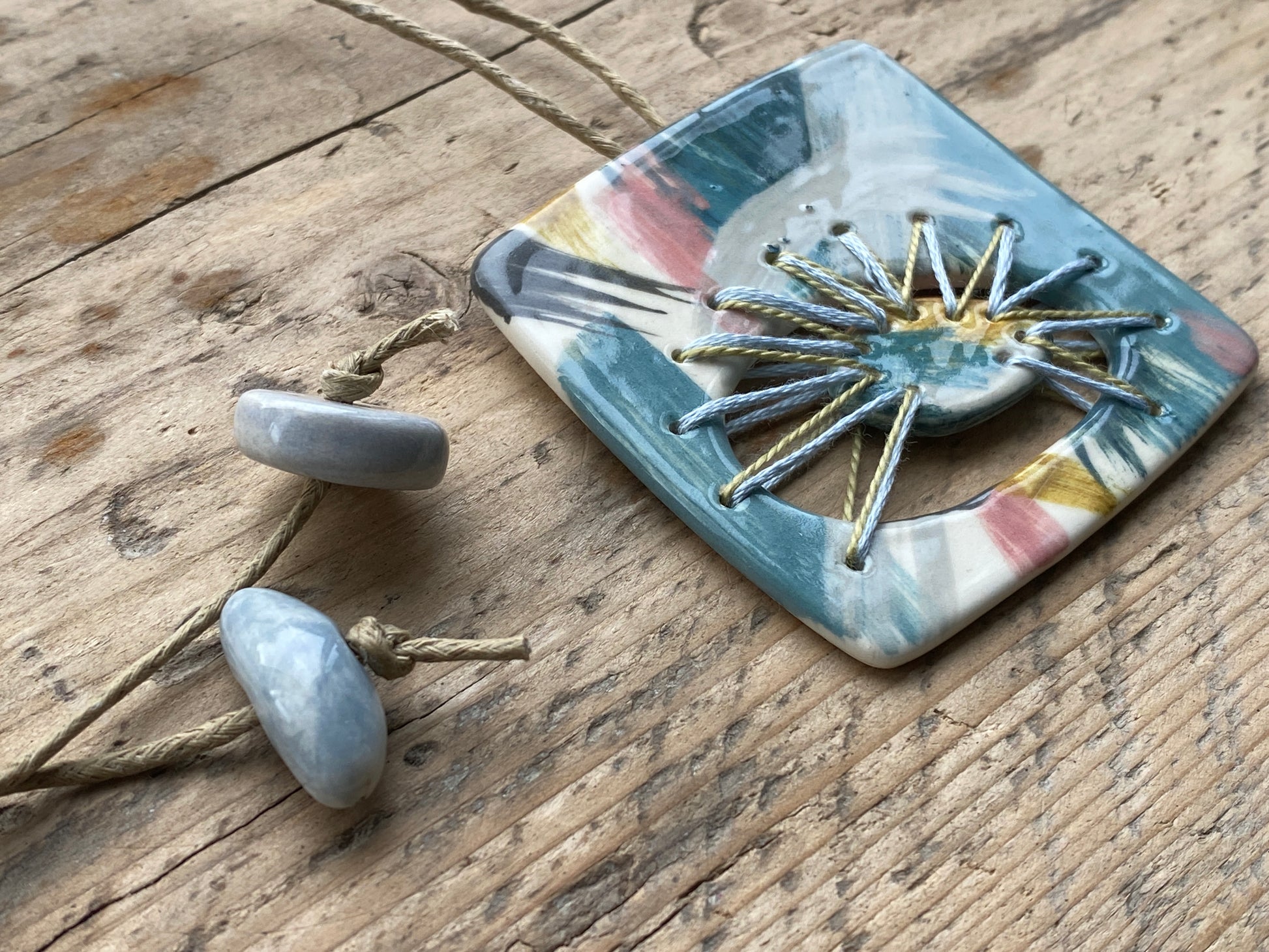 The pendant is beautifully glazed in rich pastel tones of Grey, Pink, Ochre and Teal. High quality Embroidery threads are used to stitch a fragment into the pendant finishing this unique and special handmade piece.