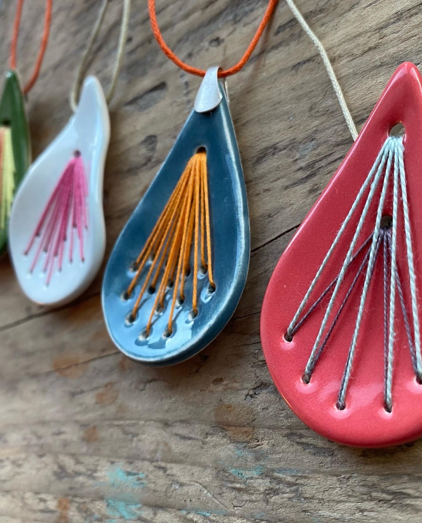 Pendant Necklace Handmade Ceramic Round Pendant with stitched element