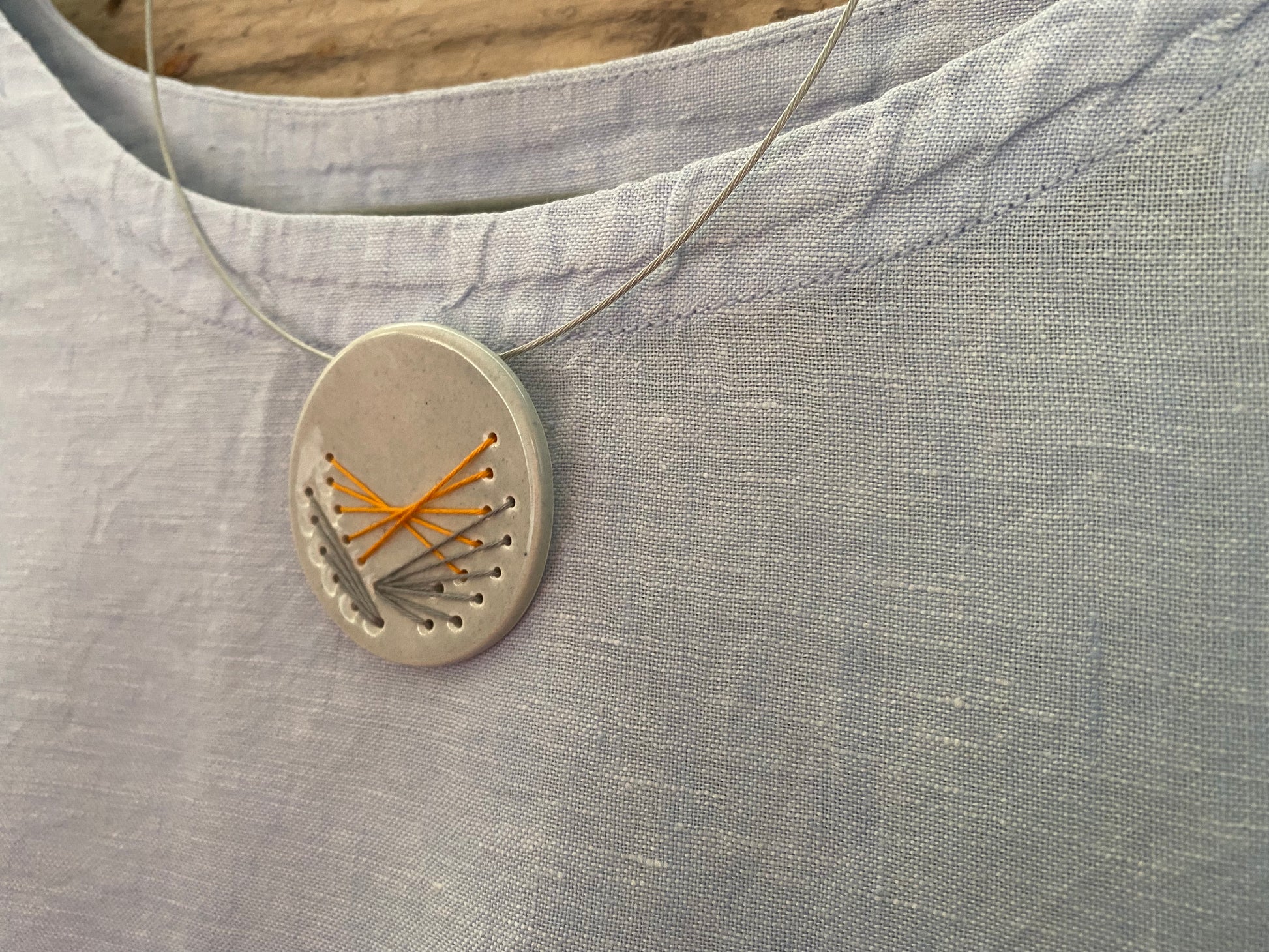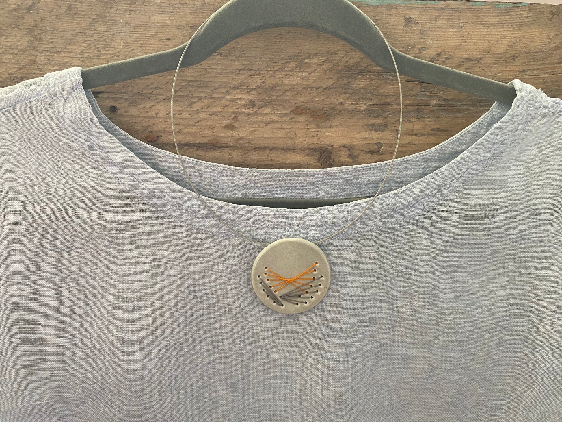This handmade ceramic pendant necklace is crafted from Earthenware clay in my garden shed in beautiful North Yorkshire. This round pendant has been glazed in a soft Grey before being twice-fired for durability. The Pendant has then been stitched using contrasting Grey and Orange embroidery threads to create a unique design giving it a completely one-of-a-kind look.