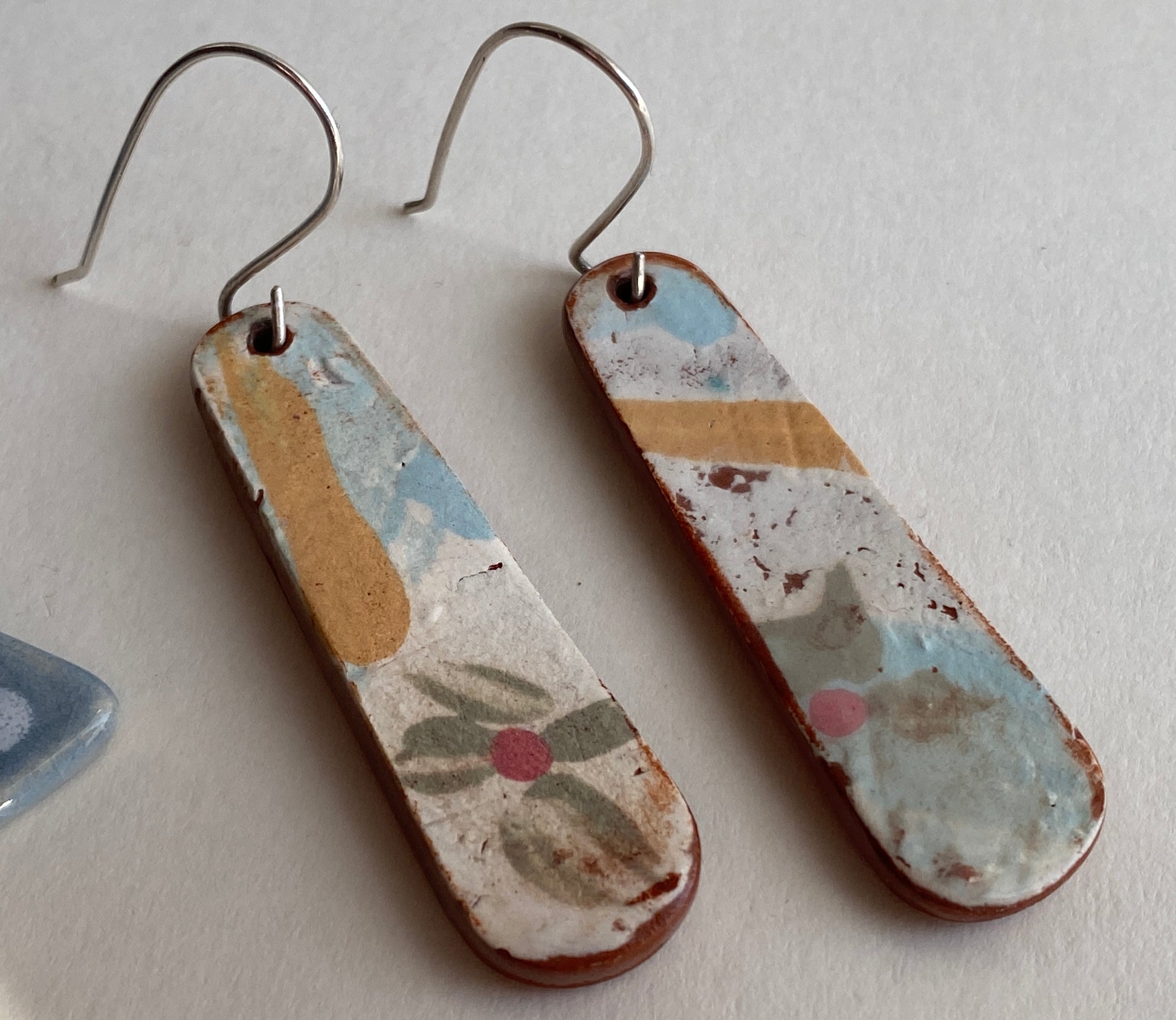 Using a ceramic mono printing technique which creates an imperfect yet charming Floral pattern on each piece. Using a soft palette of Green, blue, raspberry and orange and white these earrings are so easy and light to wear.