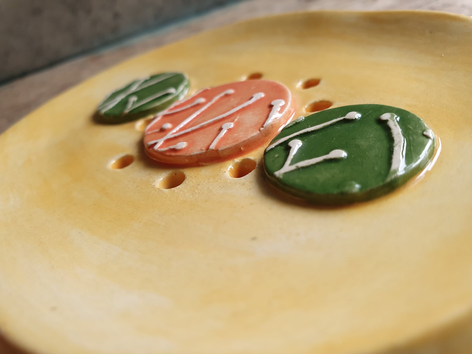 Wakey Wakey Handmade Oval Ceramic Artisan Soapdish. Glazed in Sunshine Yellow with contrasting Green and Orange disks. Imprinted with MB makers mark on the reverse. This soap dish has generous drainage holes and feet to aid water flow, the measurements are approximately 11.5 x 9.5 cm.